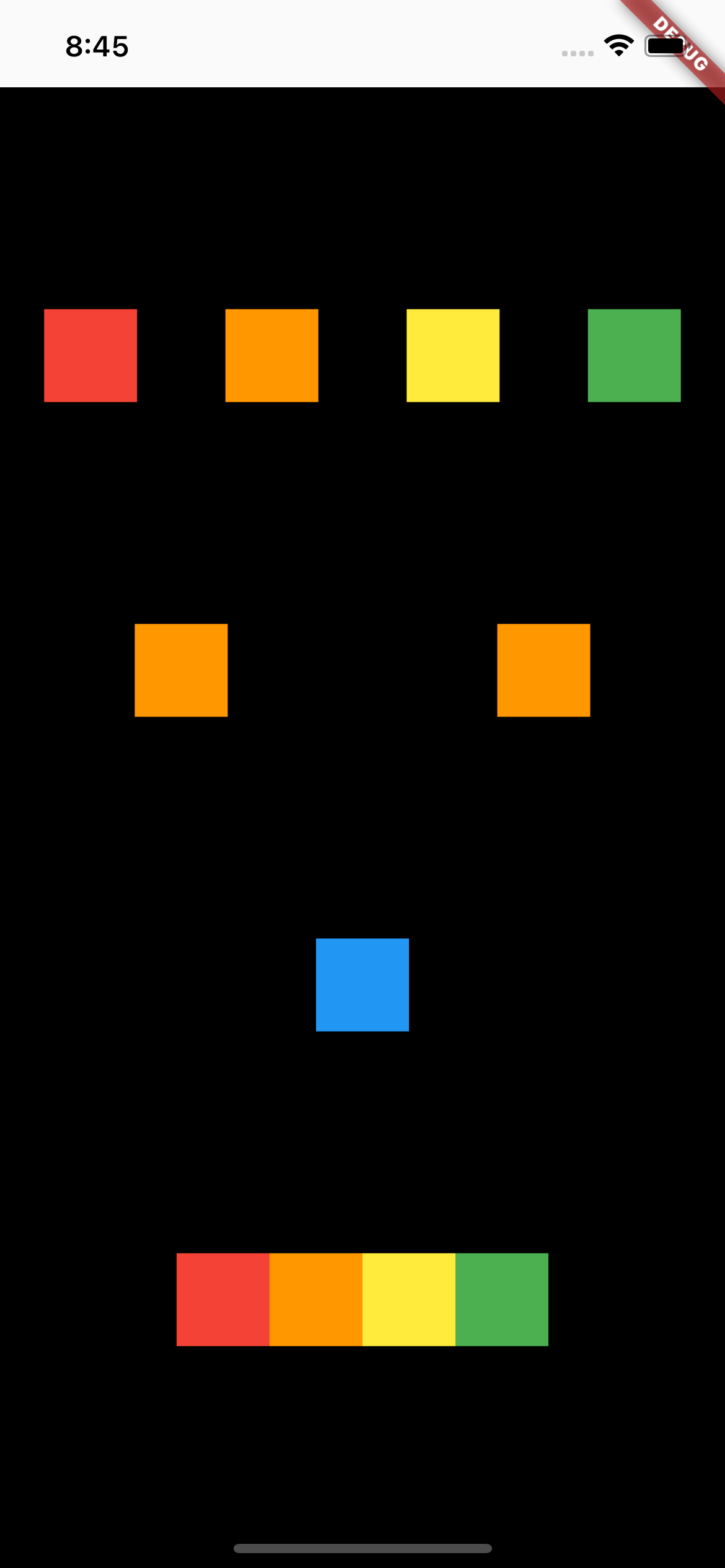 | spaceEvenly | 위젯을 같은 간격으로 배치하지만 끝과 끝에도 위젯이 아닌 빈 간격으로 시작 |