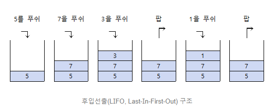 이때, 스택에 삽입하는 연산을 푸시 (push), 꺼내는 연산을 팝 (pop)이라고 한다.