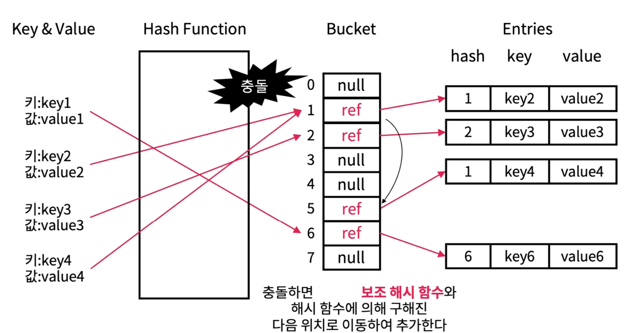 * 충돌의 의미는 서로 다를 두 키에 대해 해싱 함수를 적용한 결과가 동일한 것을 의미합니다.